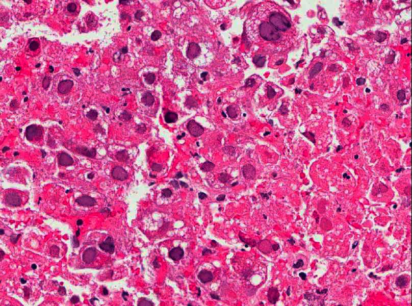 HSV hepatitis is unusual in an immunocompetent host as this patient apparently was, but has been reported (Farr RW, et al. Clin Infect Dis. 1997;24(6):1191-4). Diagnosis is often delayed because of its rarity and because mucocutaneous lesions are often absent. HSV hepatitis can present as multiple hypoechoic nodules in the liver raising neoplasm as a differential (Ak O, et al. Turk J Gastroenterol. 2007;18(2):115-8.) Although treatable, mortality is high and have ranged from 41-79% in some series (Sharma s, et al. J Clin Gastroenterol. 2004;38(8):697-704). Although rare, HSV should be considered in acute hepatitis patients especially when no apparent causes are detected, even if no immunosuppressive state is apparent. Also “nodular lesions” in this context should include HSV hepatitis in the list of differential diagnosis. When such a patient is biopsied showing unexplained parenchymal necrosis, the pathologist should consciously search for viral inclusions which could be rare and require evaluation of multiple levels and immunohistochemistry