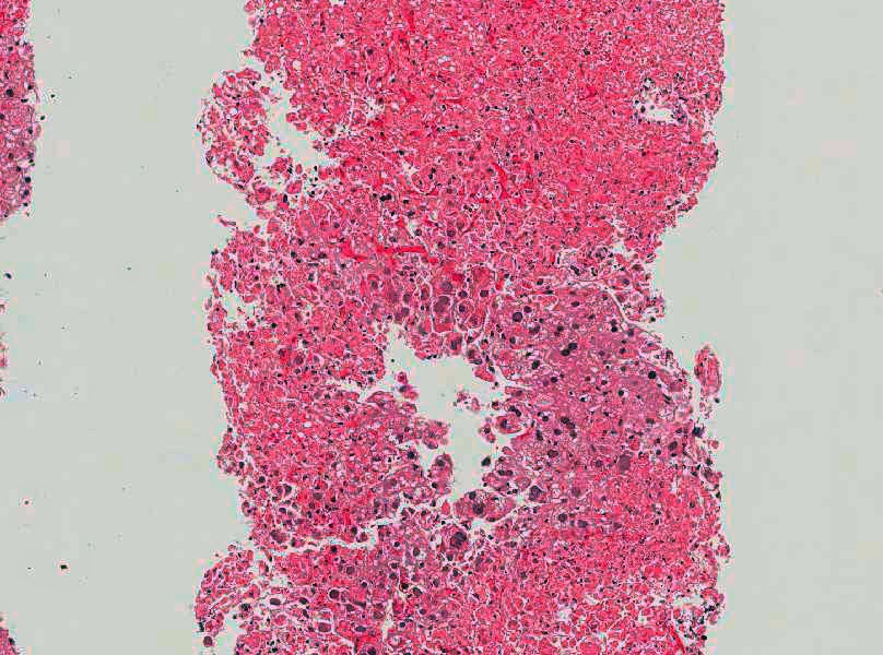58 year old man, previously healthy presented with acute liver failure and is being considered for urgent transplant. Viral serologies (HCV, HBV and HIV) are negative. Imaging studies show a massive liver with question of possible infiltrating neoplasm. Transjugular biopsy obtained as part of transplant workup.