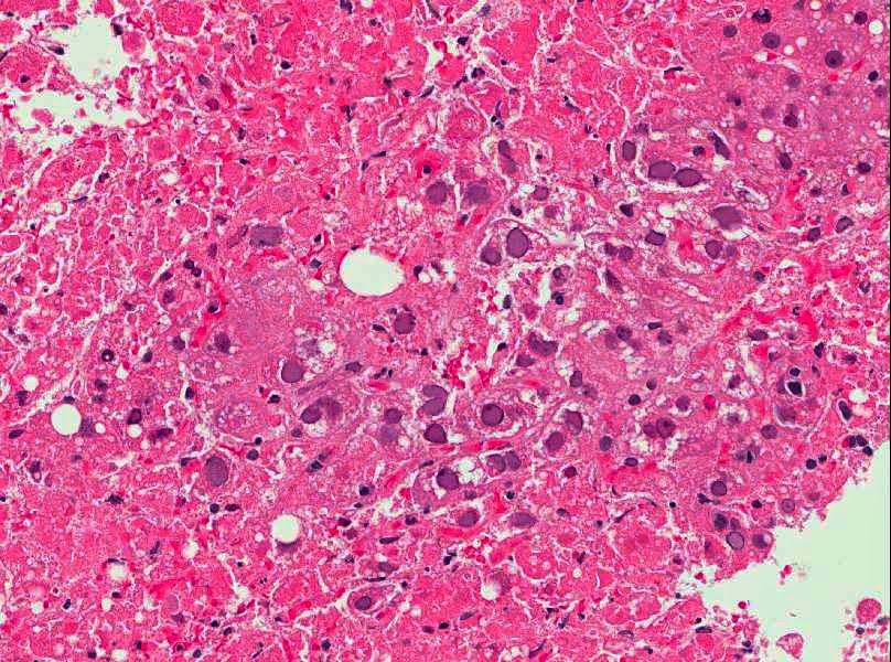 This is a case or herpes simplex (HSV) hepatitis, confirmed by immunohistochemistry. His prior history revealed nothing to explain a predisposition to this infection. The features in this biopsy are extensive parenchymal necrosis, little inflammation, and characteristic Cowdry type A inclusions in the surviving hepatocytes.
