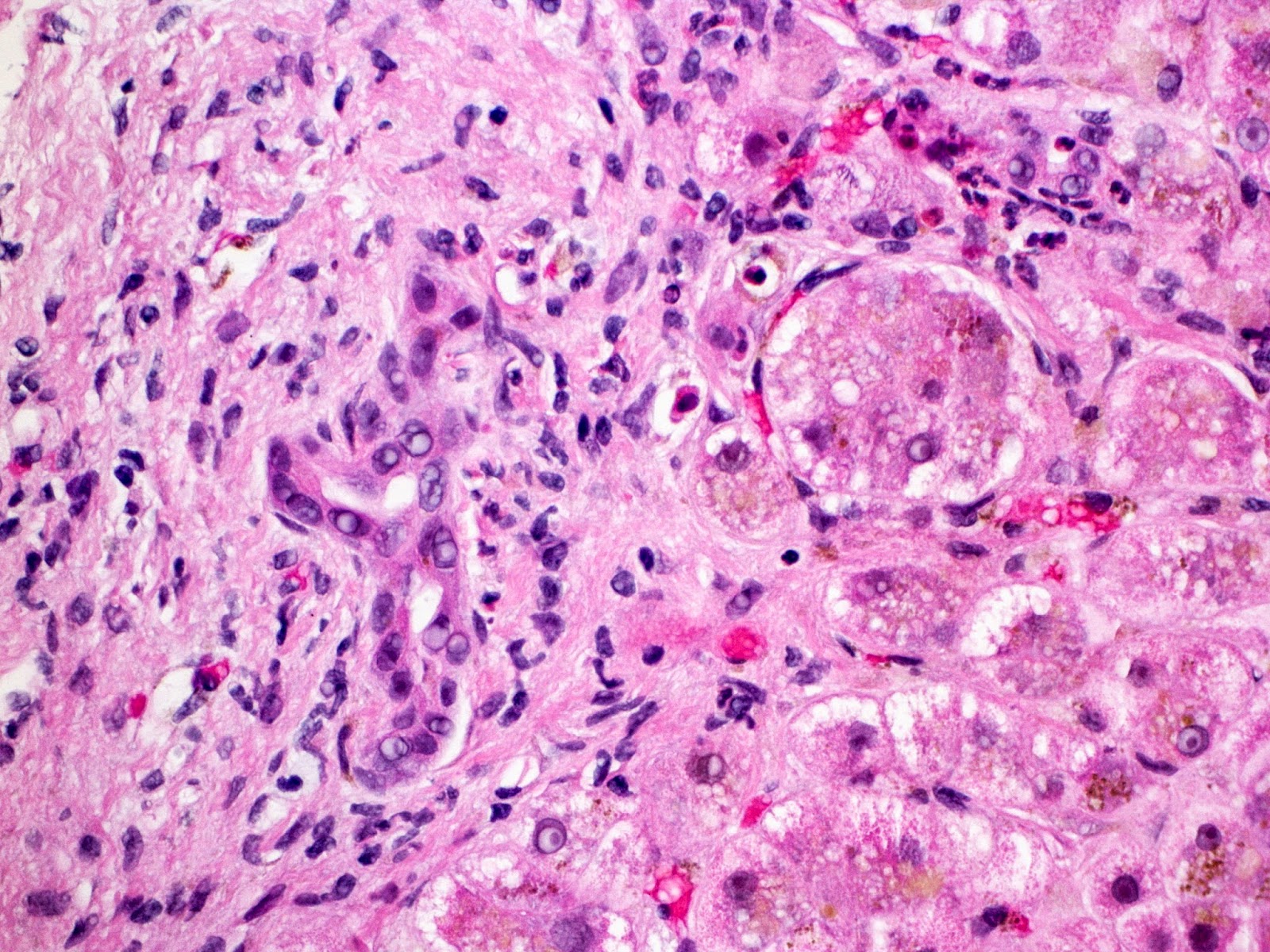 The paucity of interlobular bile ducts and lack of ductular reaction raises several possibilities. The top of the list in this setting would be chronic graft versus host disease (GVHD). However, advanced fibrosis with chronic GVHD is rarely described. From the available clinical records, this patient has a history of chronic skin and liver GVHD that has responded well to immunosuppression in the past. Furthermore, the patient intermittently electively takes herself off immunosuppressive therapy with resultant flares, as happened in this case.
