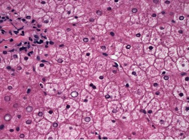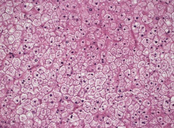 | Figure 2. Swollen and rarified hepatocytes with compressed sinusoids. |
