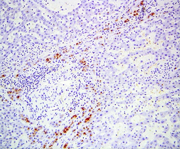 She successfully underwent living related liver transplantation. The explanted liver weighed 1233 gm and appeared vaguely nodular but not cirrhotic. Cut sections revealed no mass lesions. Micrographs from the explanted liver are shown.