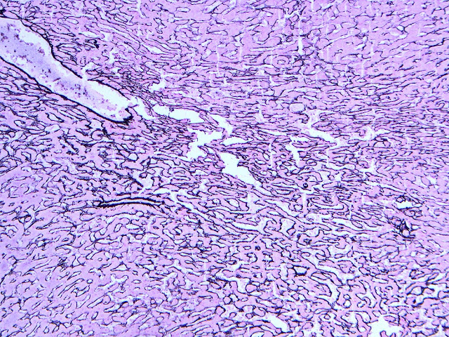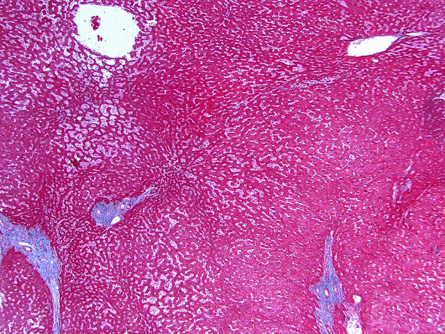 The explant showed a nodular liver with areas of sinusoidal dilatation, and occasional incomplete septae, but no evidence of cirrhosis. Rare florid ducts of PBC are present but there is mild ductopenia that came down to approximately just 20% of the terminal bile ducts; the larger bile ducts appear normal as are most of the small/terminal bile ducts. Several small portal tracts however have increased portal and occasionally periportal fibrosis and no visible portal veins. The larger portal tracts often have small portal veins when compared with the corresponding hepatic artery or bile duct, with thickening of the veins walls (obliterative portal venopathy). Reticulin stain demonstrates nodularity not bordered by fibrous septae, the edge of the nodules having compressed reticulin fibers (NRH). Sections from the hilum demonstrate major but non-occlusive portal vein thrombus.