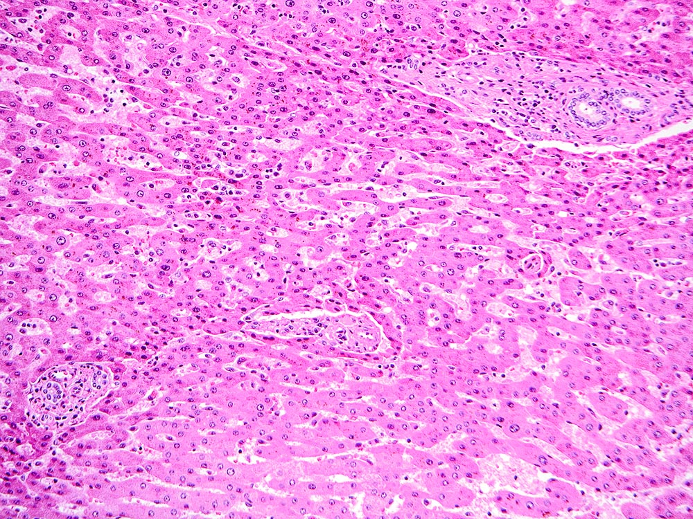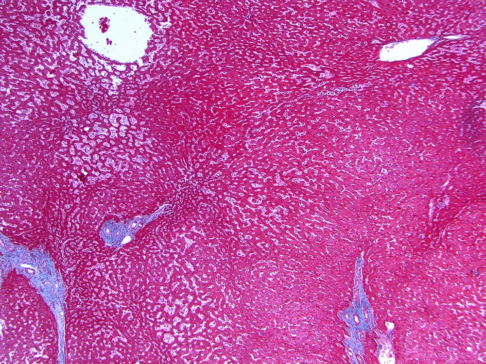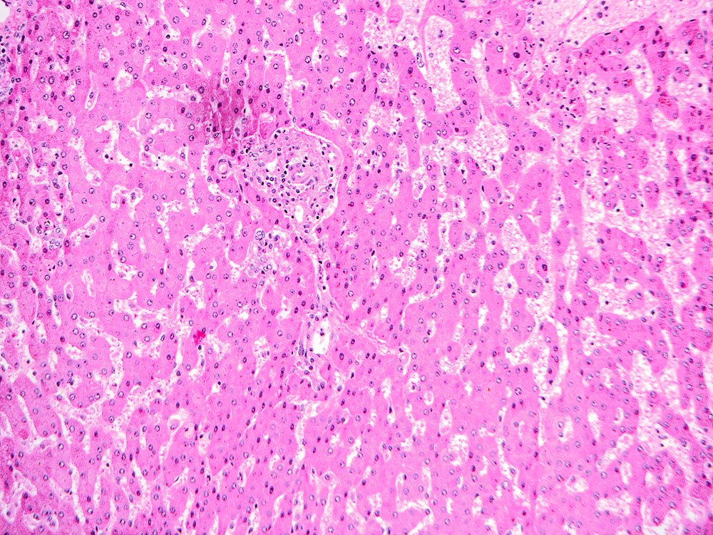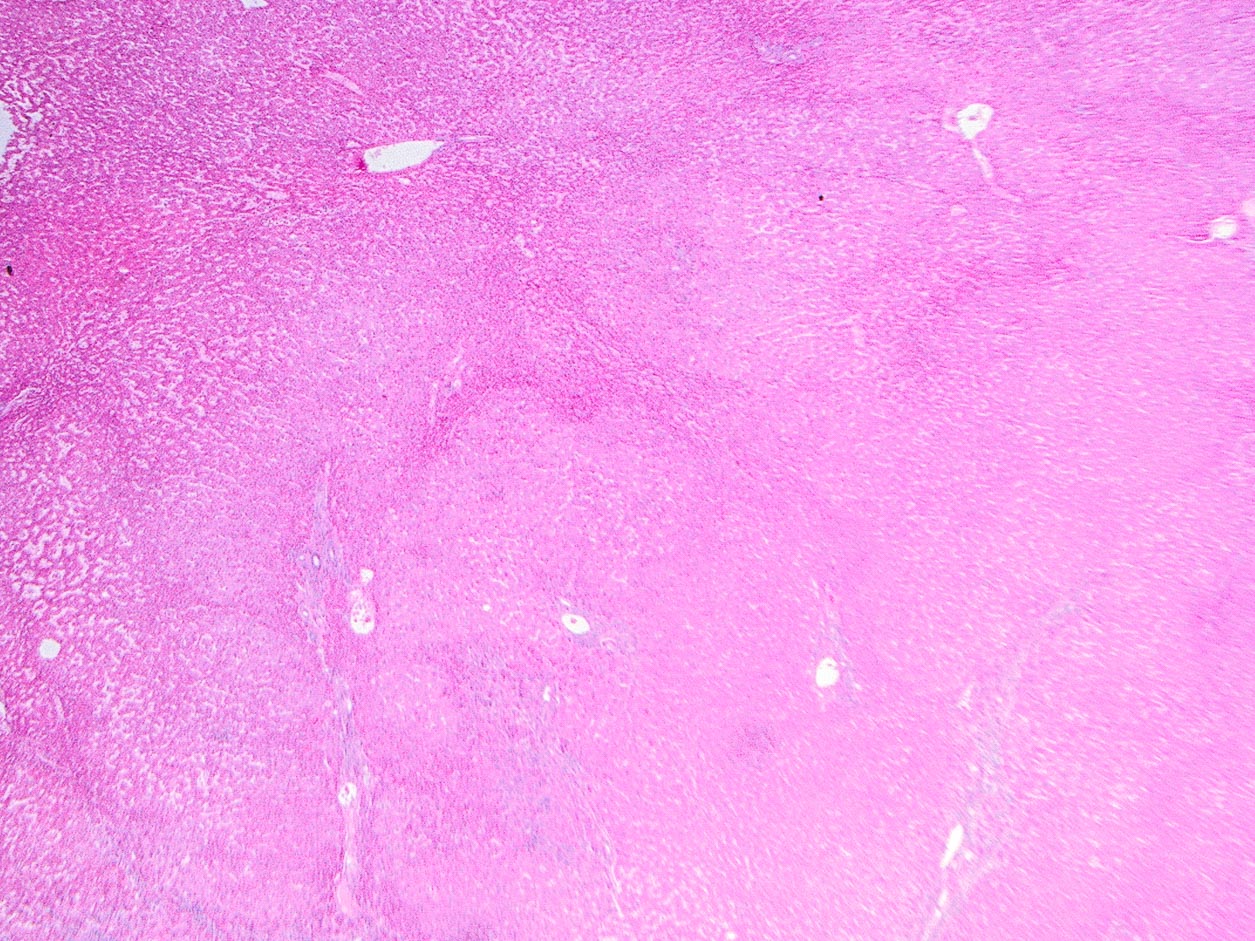 She successfully underwent living related liver transplantation. The explanted liver weighed 1233 gm and appeared vaguely nodular but not cirrhotic. Cut sections revealed no mass lesions. Micrographs from the explanted liver are shown.