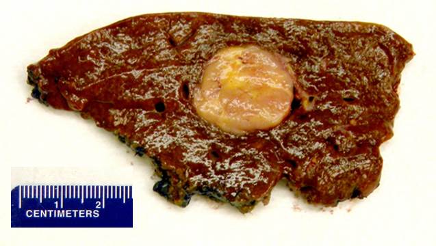 Abdominal MRI demonstrated a 3.1 cm lesion in the right lobe of the liver. The lesion showed prompt arterial enhancement and gradual washout. Fine needle aspiration (FNA) and needle core biopsy was performed. FNA disproved metastatic disease and prompted a partial hepatectomy.