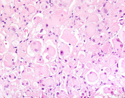 The liver biopsy showed an infiltrative neoplastic process with a solid to vaguely organoid growth pattern. The tumor was composed of large plump cells showing an epithelioid and plasmacytoid appearance. The tumor cells had abundant eosinophilic cytoplasm with low nuclear to cytoplasmic ratios and frequent multinucleated giant cells. Mitotic figures were rare. Necrosis was not detected. The background liver exhibited no features of chronic hepatitis or cirrhosis.
