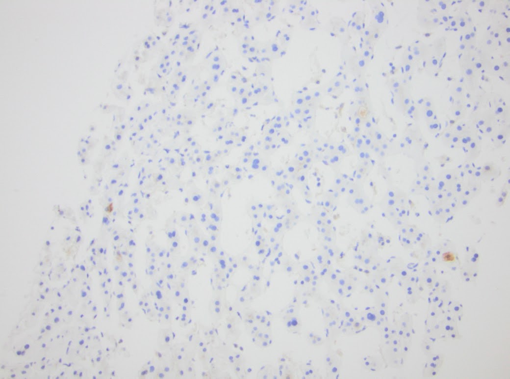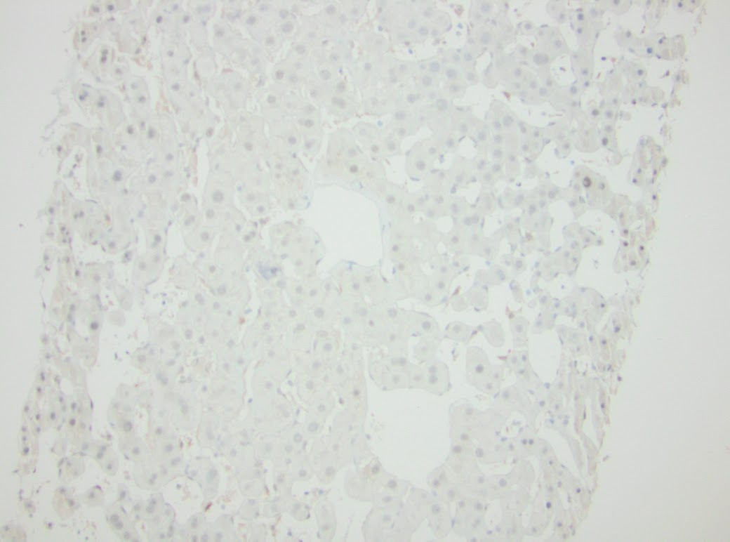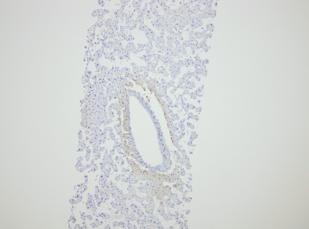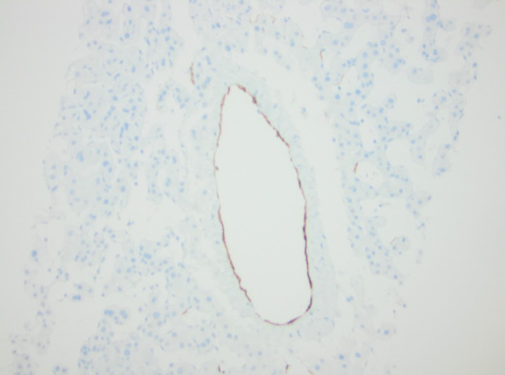 The panel of immunohistochemical stains were quite helpful in the evaluation for hepatic adenoma. CRP (Figure 4) is interpreted as negative and therefore, the diagnosis of telangiectatic adenoma is not supported. LAFBP retained staining and therefore, type 1 hepatic adenoma is not supported. In addition, the absence of macrovesicular steatosis does not support this diagnosis. Heat shock protein 70 (Figure 6) is negative and no nuclear staining is seen using Beta-Catenin. CD34 (Figure 7) highlights the vessels within the portal tracts and fails to stain in the area with the dilated sinusoids. Glutamine Synthetase (Figure 8) shows the typical zone 3 pattern of staining, and therefore, the diagnosis of focal nodular hyperplasia is not supported.