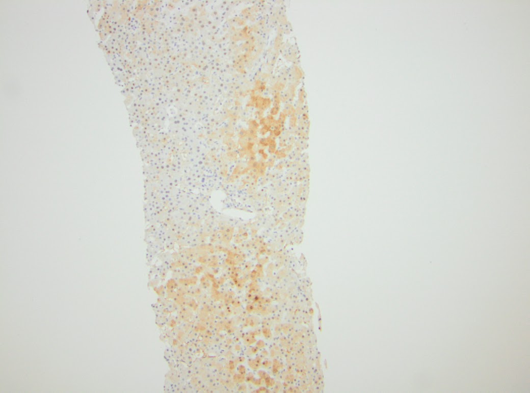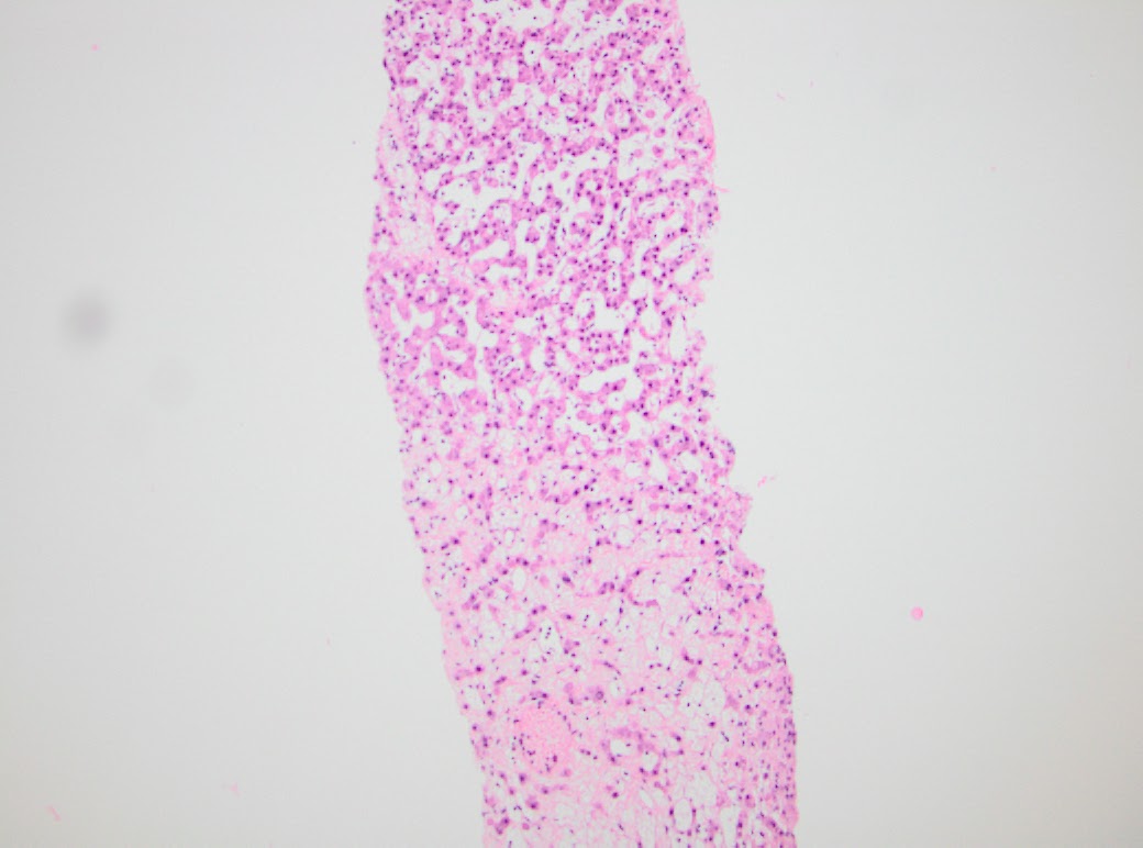 February and June 2015 needle core biopsies were performed. Provided for review are two parts of core needle biopsies obtained from 2015. The first core needle biopsy from February of 2015, site unspecified consists of three portal tracts without significant fibrous expansion. No steatosis or significant histopathologic findings are seen. The second specimen labeled mid lesion #2 shows quite different histopathologic findings of striking sinusoidal dilation and corresponding hepatocyte atrophy (see Figure 1).