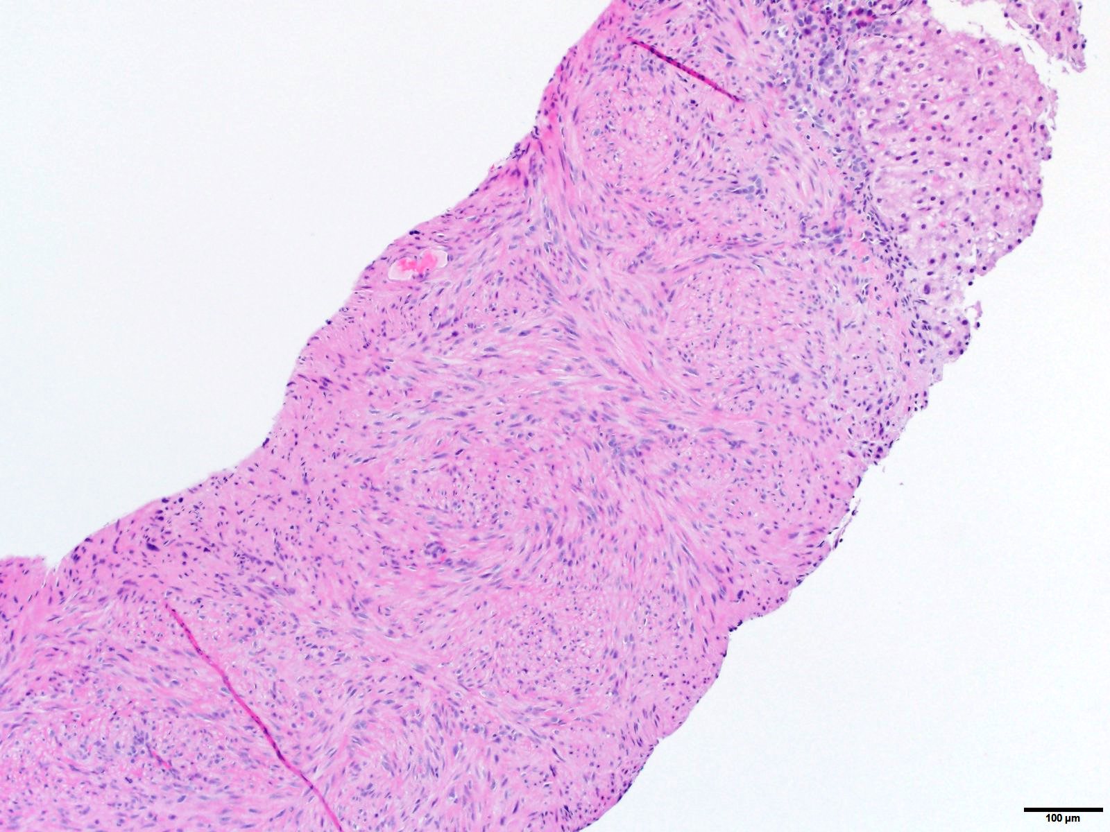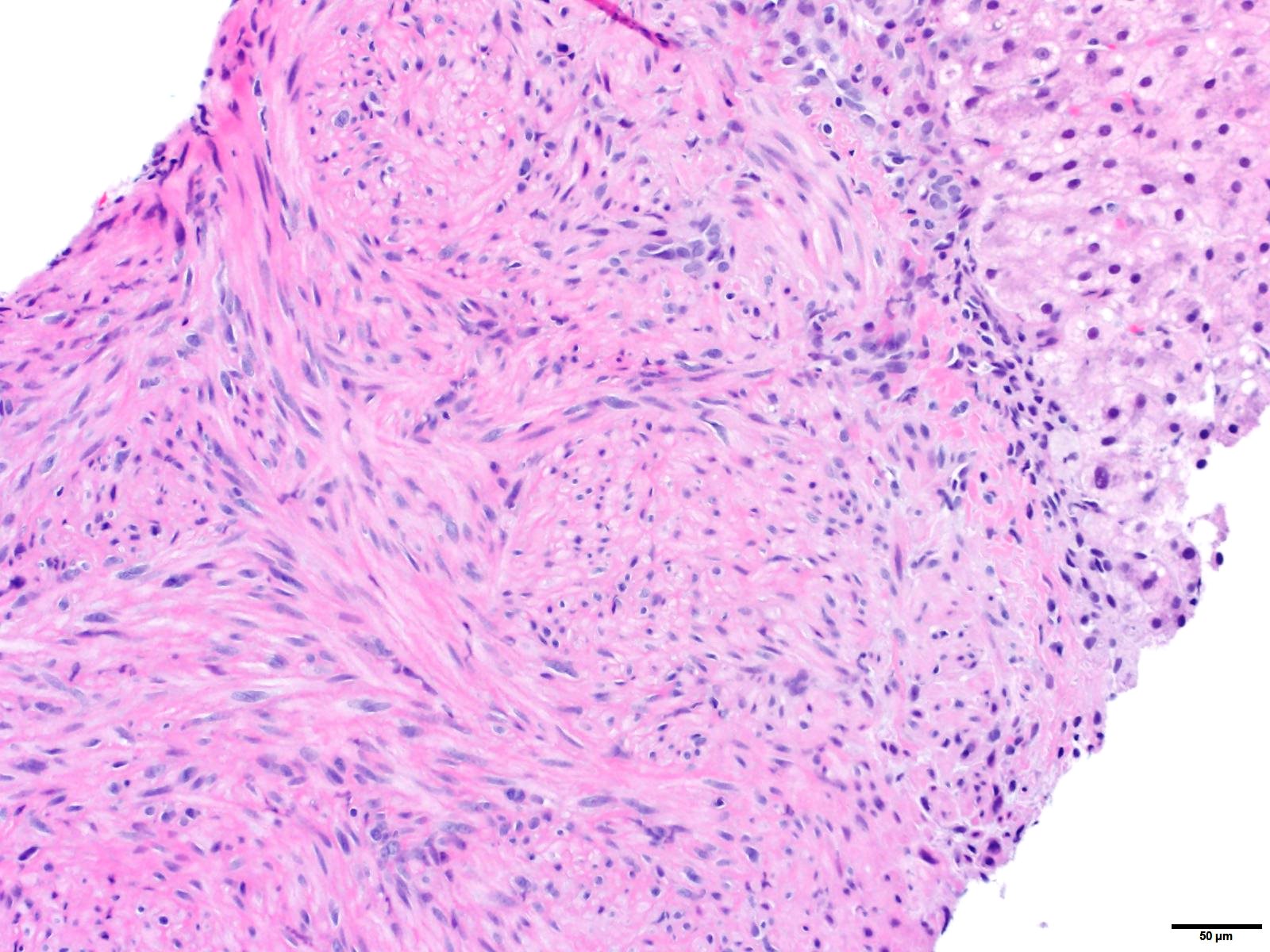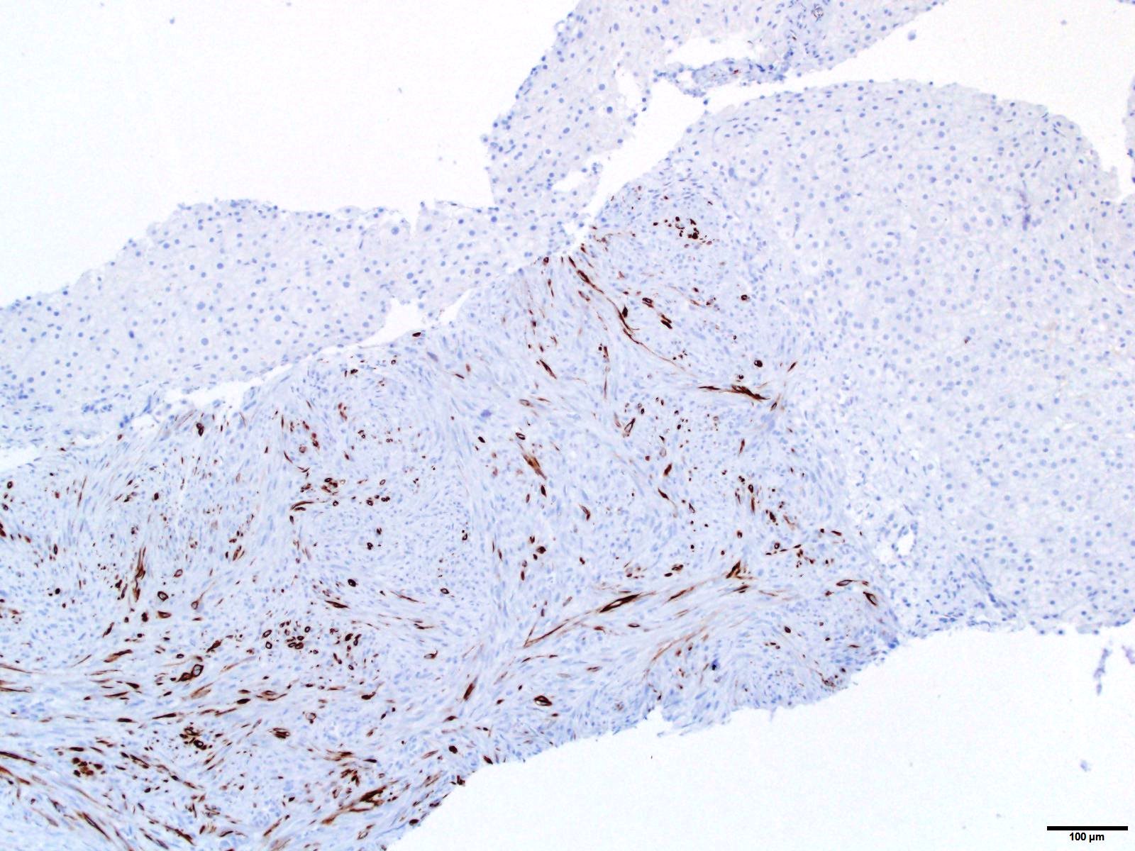 The liver biopsy showed spindled tumor cells arranged in short intersecting fascicles. The tumor cells were bland, demonstrating elongated nuclei with blunted ends and abundant eosinophilic cytoplasm. No significant cytologic atypia was identified. Mitotic activity and tumor necrosis were not conspicuous. The background liver was unremarkable.