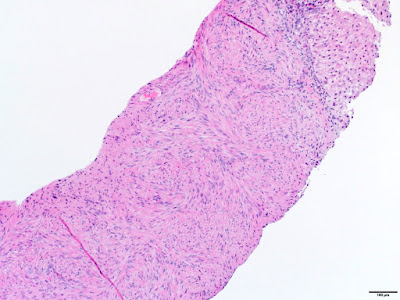 The histologic features of these tumors include spindled cells arranged in fascicles. Tumor cells have eosinophilic cytoplasm with elongated, blunt-ended nuclei. Two unique histologic features have been described, which include a variable number of intratumoral lymphocytes and occasional primitive round cell areas. Histopathologic features may vary in terms of cellular atypia, mitotic activity, and necrosis.